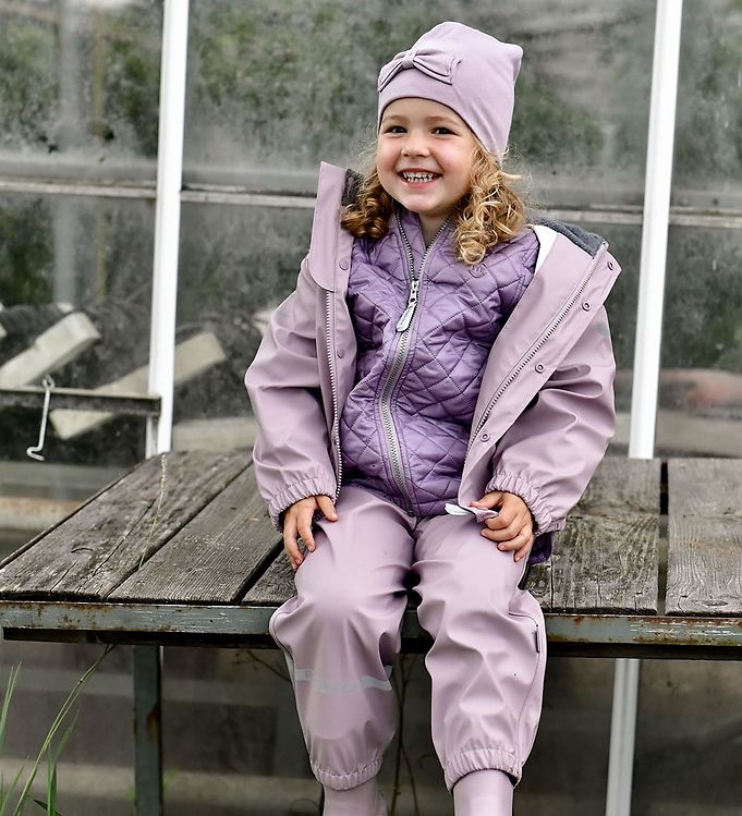 Til storesøster har vi modtaget et flot PU regntøjsæt i en flot lilla farve (“nirvana”). Regntøjet har et vandsøjletryk på 5.000, det er vindtæt, har reflekser ved knæene, og kraven er forret med blød fleece, som varmer og beskytter mod vinden - så smart! Regntøjet er dernæst miljøvenligt, da det er lavet af genanvendelige materialer. Vores pige synes, at farven er så smuk, og hun skyndte sig at tage regntøjet på, da hun så det. Lynlåsen er tyk og nem for hende selv at lyne op og ned. Vores pige efterspørger dog lommer i jakken til alle de sten mm., som hun finder og samler rundt omkring.